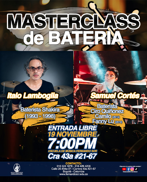 Inscribirme GRATIS ahora Masterclass de Batería con los Bateristas de Shakira, Camilo, Fanny Lu y Ciro Quiñónez Entrada Libre 19 de noviembre – 7:00 p.m. Escuela de Música Fernando Sor…