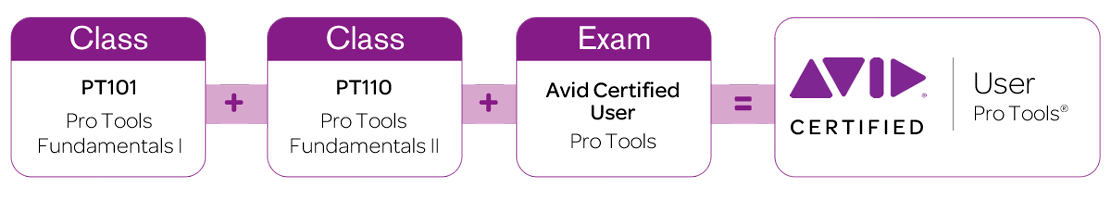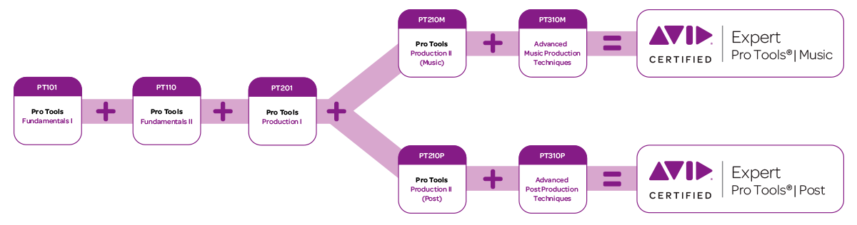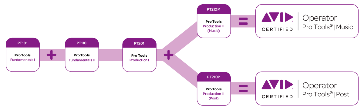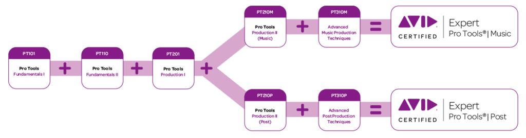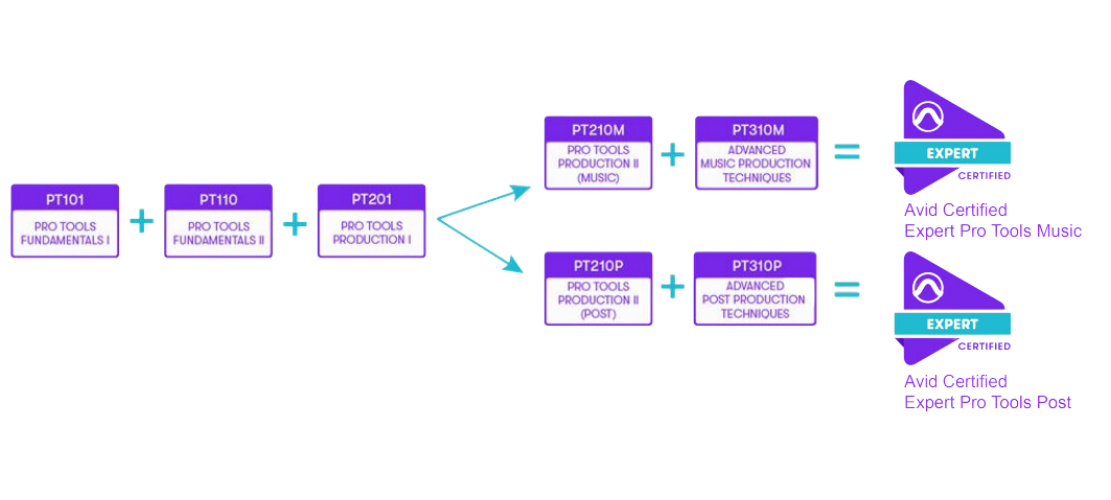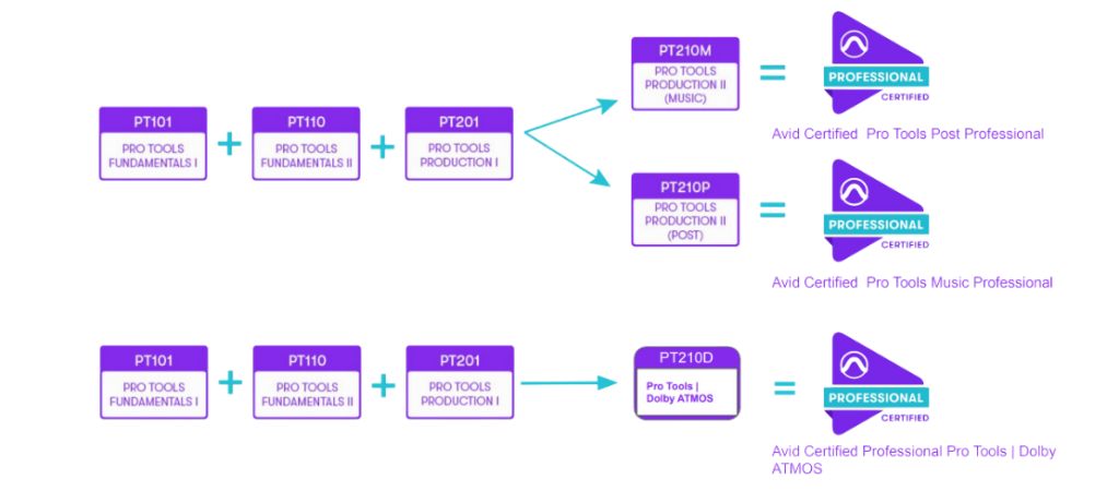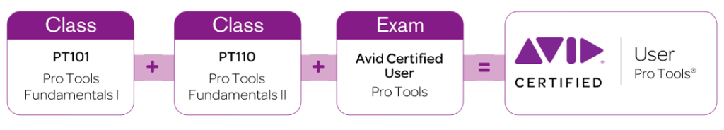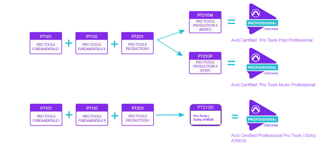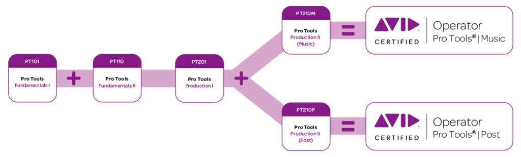 Para tener la certificación completa de Pro Tools se requiere realizar varias certificaciones las cuales son: PRO TOOLS USER FUNDAMENTALS I (101) FUNDAMENTALS II (110), PRO TOOLS OPERATOR, PRODUCTION I (201) PRODUCTION II (Music) (210M) y EXPERT (Music) (310M) y (310P) (Post).