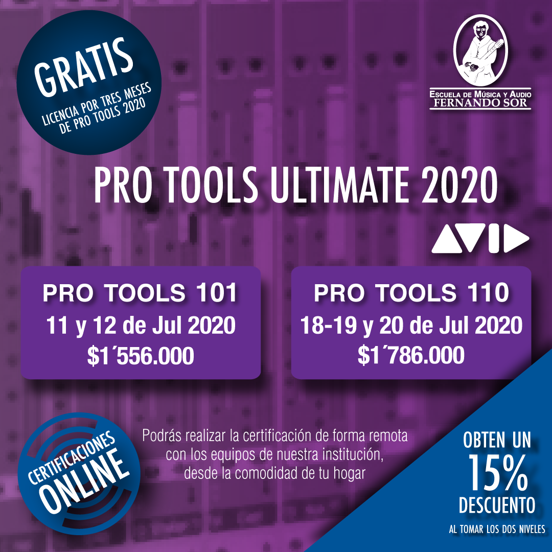 Al tomar la certificación con nosotros podrás usar los equipos de nuestra institución de manera remota; adicional recibirás una licencia de Pro tools 2020 por 3 tres meses totalmente gratis.