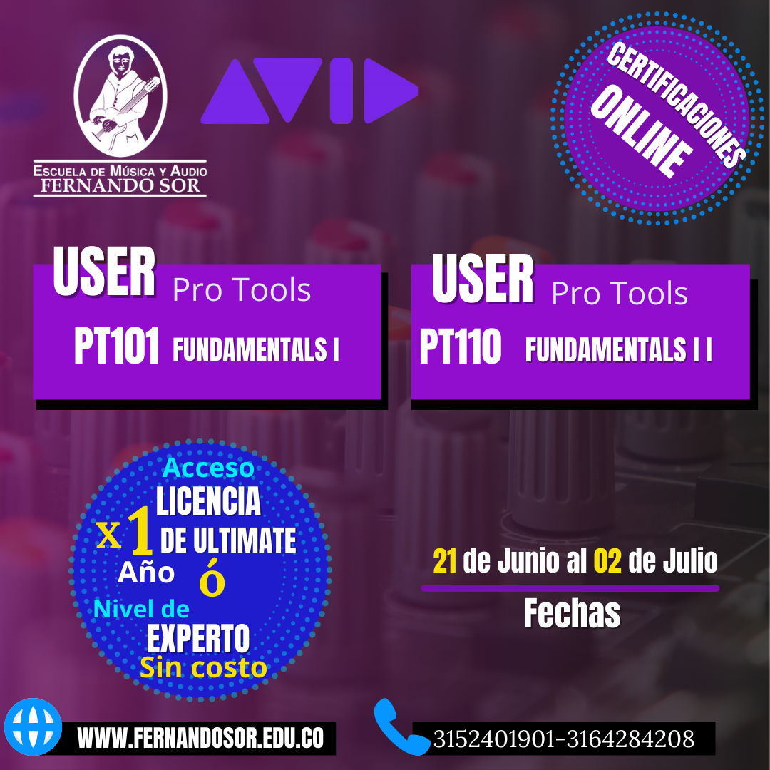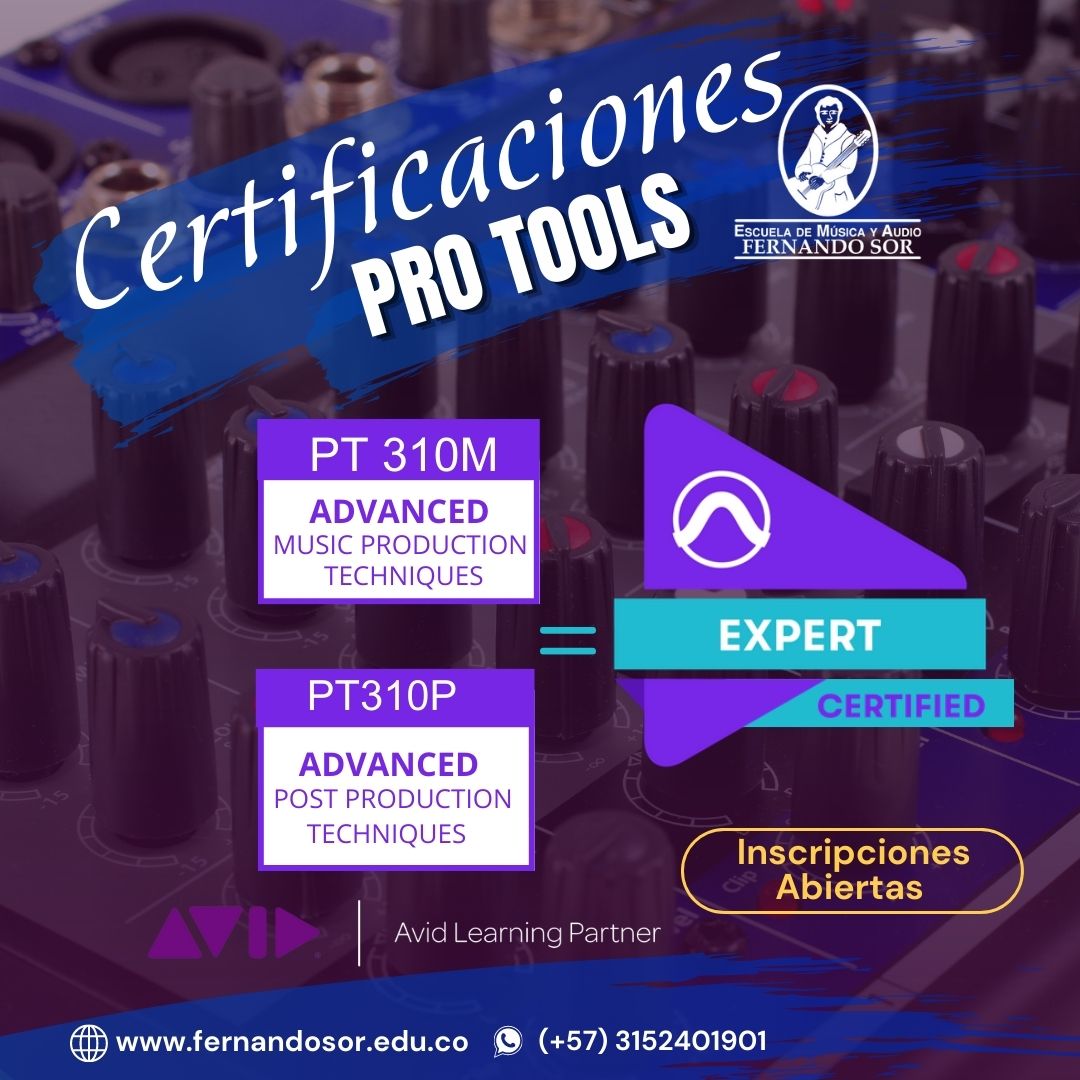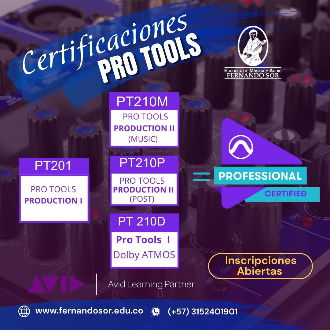 Certificaciones Avid Pro Tools, la escuela de Música y Audio Fernando Sor certifica en Pro Tools Ultimate de Forma Presencial ó  Virtual a través de Avid validando las habilidades del usuario de principiante a experto.