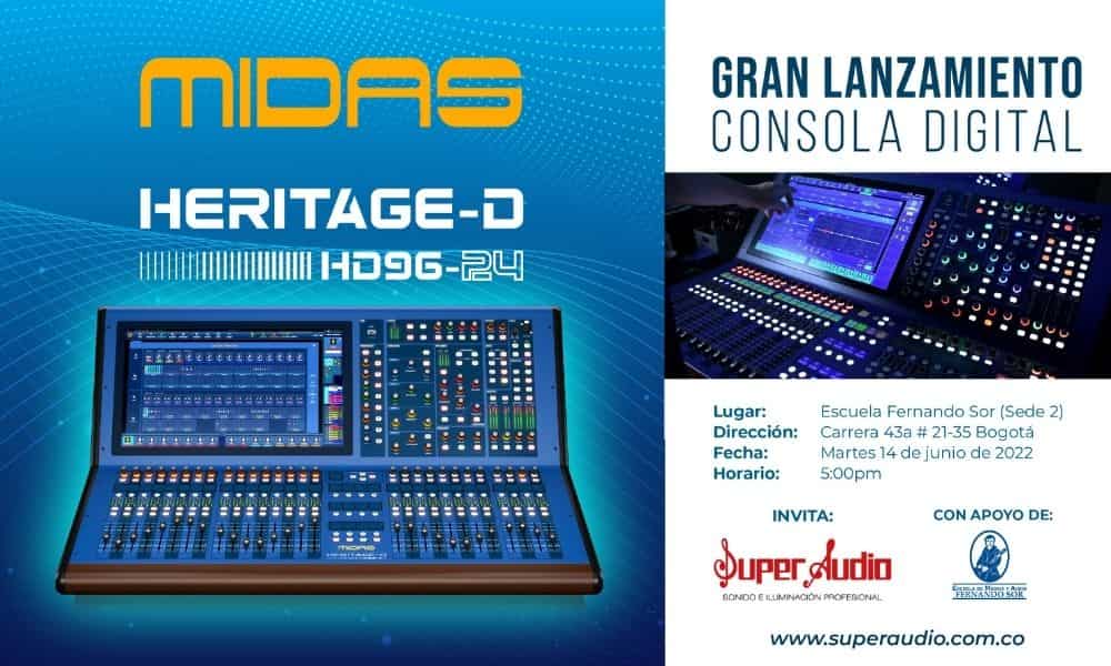 Super Audio S.A.S. con el apoyo de la Escuela de Audio Y Música Fernando Sor los invita a que nos acompañen este próximo martes 14 de junio al lanzamiento de una la consola con la que Midas y MusicTribe nuevamente están revolucionando la industria del sonido en vivo. La poderosa Midas Heritage-D HD96-24 ya está en Colombia y queremos que conozcas todas las innovaciones que trae.